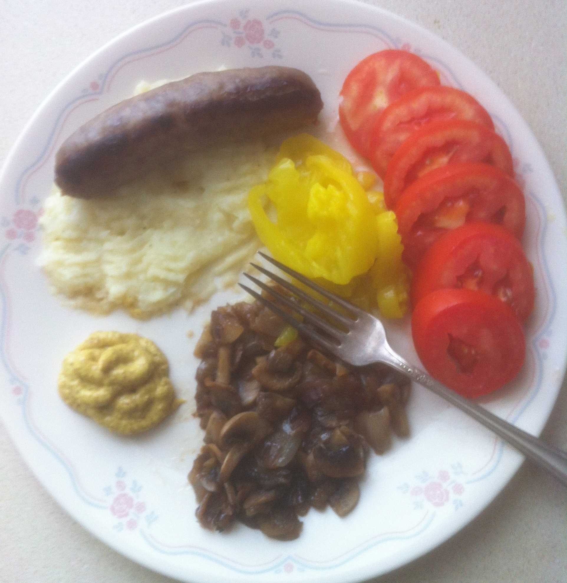 Leftover bangers and mash, as well as sautéed mushrooms and shallots. I added a sliced Roma tomato, spicy mustard, and a pile of hot pickled banana peppers. Great stuff!